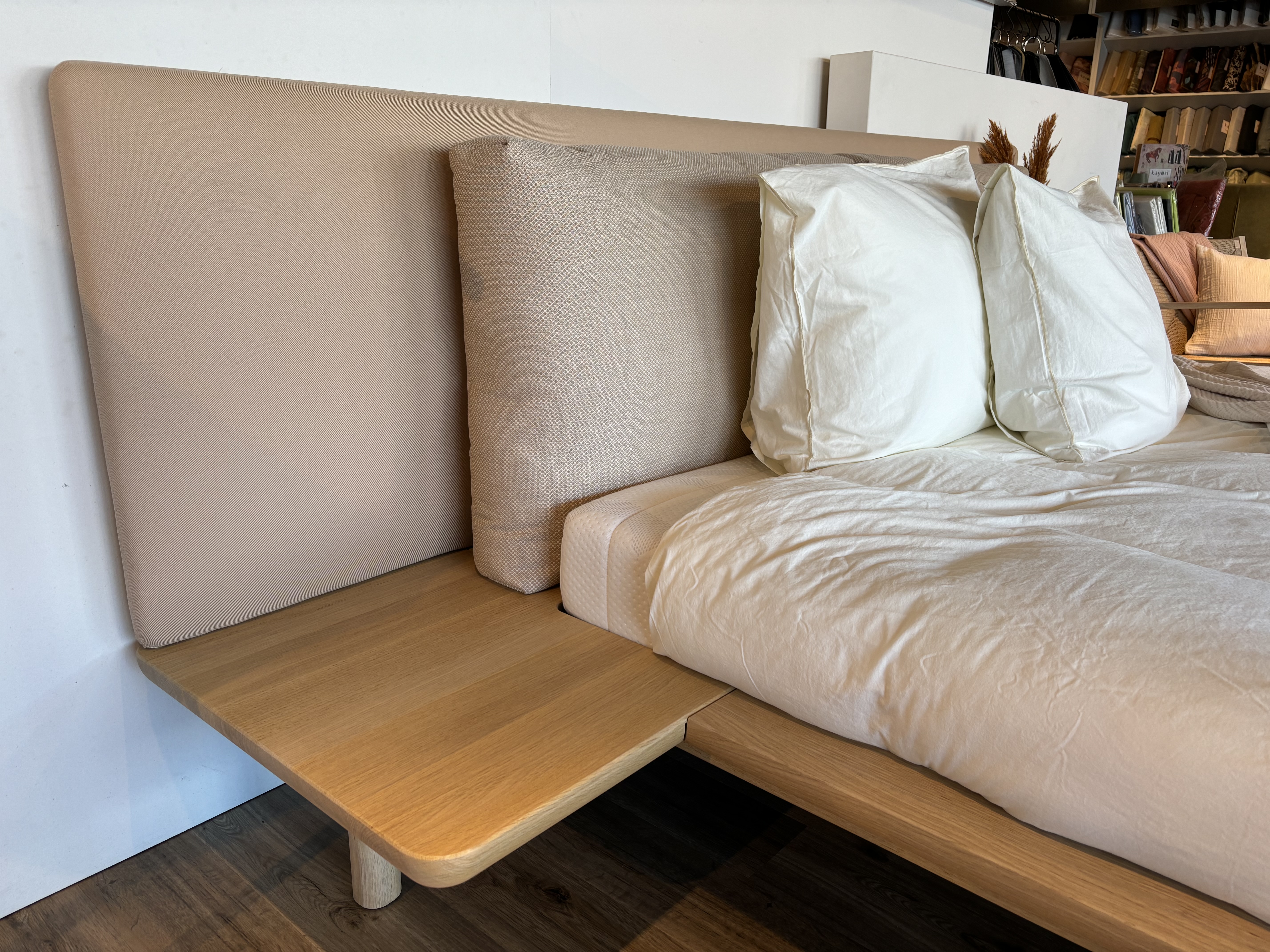 Het Showroommodel is in de kleur Solid Oak , met de meest luxe stofgroep E en vlakke spiralen . Natuurlijk kunt u ook de  Auping matrassen kiezen , neem daarvoor contact op met De Bedden op tel nummer 0223624093.